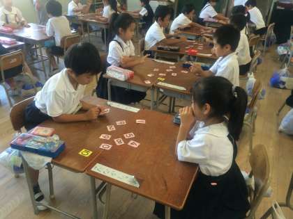 算数「20までの数」の学習です。二人組でゲーム形式でやっています。「18は、10といくつ?」の問題に、みんな元気にカードをとりました!