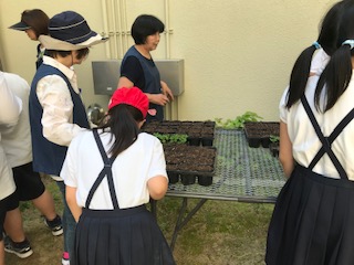 6月6日、前回5月に種まきをしたマリーゴールドが成長したので、鉢に植え替える作業をしました。今回も地域の花苗ボランティアの方々にたくさん集まっていただき、飼育栽培委員の子どもたちと植え替え作業をしました。