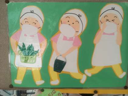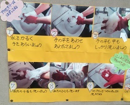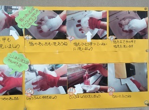 給食室前に「上手な手洗いの仕方」について、かわいらしい掲示物を作っています。よくわかるように赤と白の軍手を使い、石鹸の泡も綿で工夫しています。みなさん、しっかり手洗いをしましょうね!