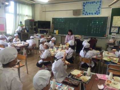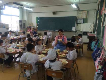 1年1組では教育実習生のT先生が、今週で実習が終了するので、子ども達とおしゃべりしながら最後の給食を楽しみました。