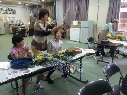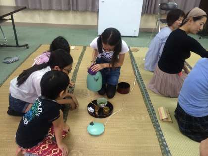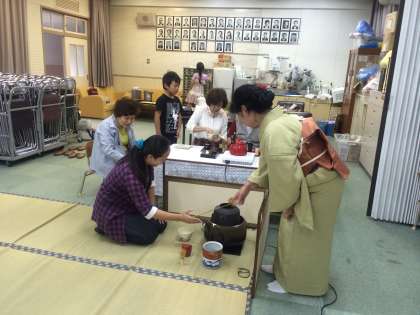 今日午後からは、生涯学習ルームのお茶と生け花の教室が開かれていました。小学生も参加しています。お茶の教室では、本校卒業生のFさんが、ていねいに教えていました。