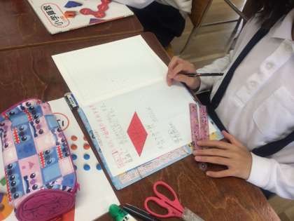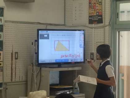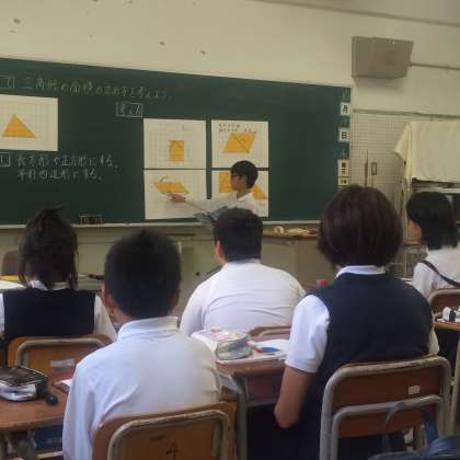 5時間目、5年2組で算数の「三角形の面積の求め方を考えよう」の研究授業を行いました。三角形の紙を切ったり貼ったり、2つ合わせたりして今までに習った長方形や平行四辺形の面積の求め方をもとにして考えることができました。いろいろな方法が出た後、分類し、次の公式へと結びつける考えのもとを、みんなで学び合うことができました。どの子もよく考え、発表し、友達の考えをよく聞いて学習を深めることができました。