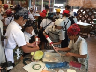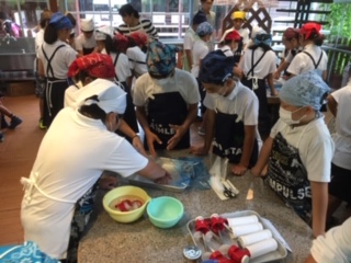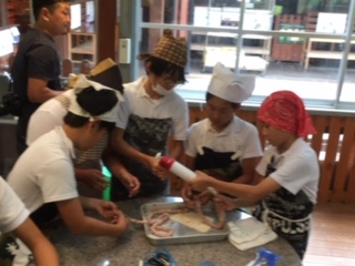モクモクファームでウインナーづくりに挑戦しました。班ごとにテーブルに分かれ、2種類の豚肉を味付けしながらこねます。道具を使って羊の腸に豚肉をつめていきます。形を整えてボイルしたら完成です。手づくりウインナーは家族へのおみやげです。