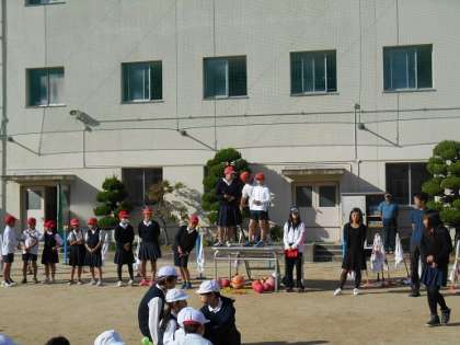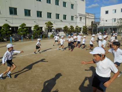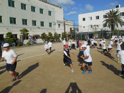 今日の集会は、「ハンター」というゲームでした。赤帽子をかぶった児童が白帽子の児童を追いかけて、タッチをします。そして、タッチされるとトラックの外に出るという内容でした。お天気も良く、気持ちの良い青空のもと、児童の歓声が運動場に響き渡りました。いつも楽しいゲームを考えてくれる集会委員のみなさん、ありがとうございました。