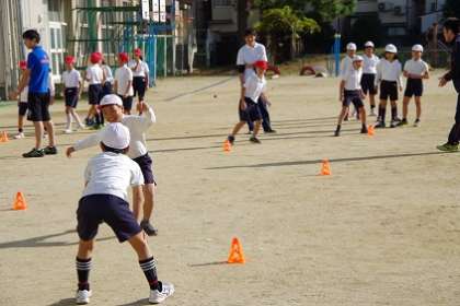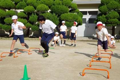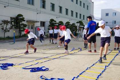 10日(月)5時間目、新大阪にある「大阪ハイテクノロジー専門学校」のスポーツ科学科の先生と学生さんに、「走る運動」の基礎を教えていただきました。瞬発力、敏捷性、体のバランスのとり方などを楽しみながら体験しました。