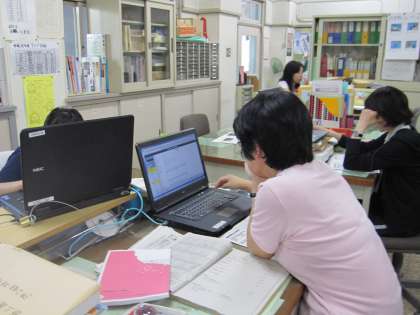 暑い夏本番。プール水泳指導の後、先生たちは、パソコンに向かってホームページ作りと、ICT教育の研修です。