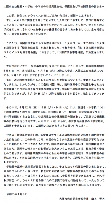 幼児・児童・生徒、保護者及び学校関係者の方々に対する教育長メッセージが発信されました。