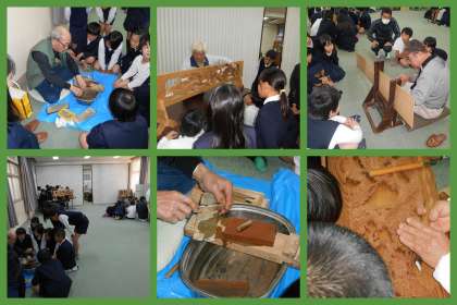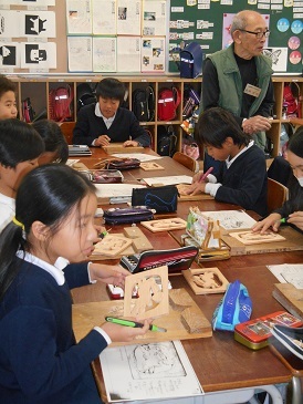 18日(火)大阪の伝統工芸「大阪欄間」の出前授業を受けました。本物の欄間や実際に彫るところを見せていただいた後、一人一人がミニ欄間作りを体験しました。なかなかいい手つきでほめていただきました。この中から、将来欄間職人が誕生するかも!?