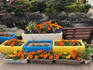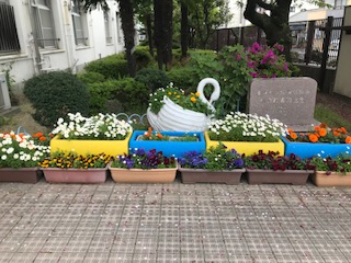 正門ではプランターの花がきれいに咲いています。