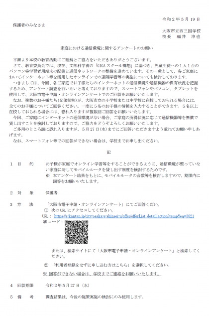 本日(5/19)と明日(5/20)の登校日に「家庭における通信環境に関するアンケートのお願い」というプリントをお配りしております。
