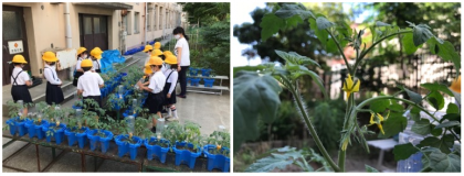 2年生は、暑い中、ミニトマトがしっかり育つように水やりをしていました。成長の早いものは花が咲いていました。
