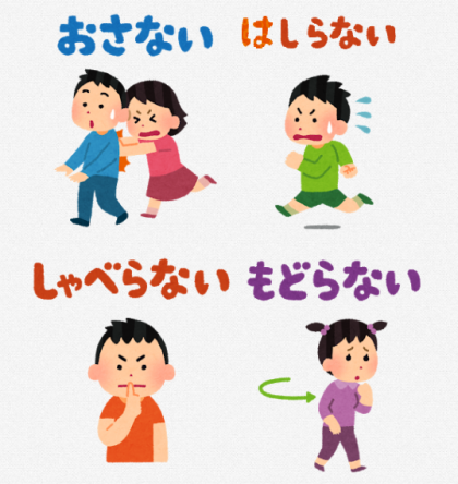 みんなが安全に避難するには、一人ひとりが【 お・は・し・も 】を守って避難することが大切です。