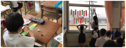 さて、2年生の「せいかつ」では、たなばた飾りを作っていました。窓を笹に見立て、みんなの願いを込めた短冊を先生が貼っていました。
