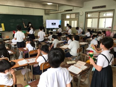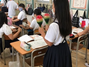 4年の音楽では、歌に打楽器を合わせて演奏をしています。電子黒板から流れてくる「いろんな木の実」のリズムに、ギロ、マラカス、クラベス、ウッドブロックを演奏していきます。