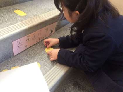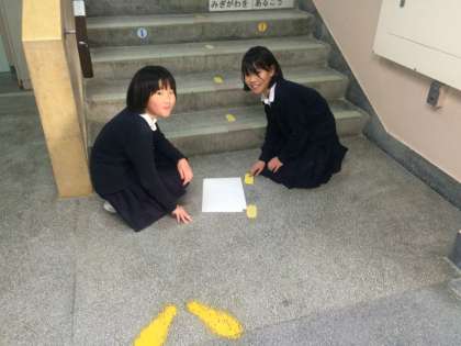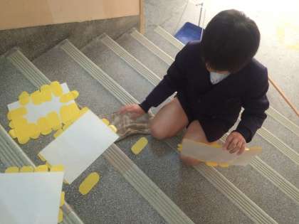 4年1組の子どもたちが、階段のステッカーの張替を手伝ってくれました。「自分たちの学校は、自分たちできれいに、使いやすくする。」という心意気がとてもうれしいですね。ありがとう!!