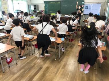 1年生の教室に近づくと、とても盛り上がっているような声が聞こえてきます。今日の授業で、「しろくまのジェンガ」を踊っているのです。