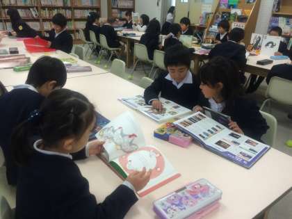 自分で読みたい本を選んで一生懸命読んでいます。今日も淀川図書館長さんが、絵本の整理を手伝いに来てくださいました。1年生にも10進分類の一部を教えたら、「本が探しやすくなった!」とうれしそうでした。