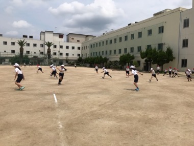 今日はあいにくの曇り空。湿気が多く蒸し暑かったですが、4年生の体育ではみんな元気に頑張っていました。