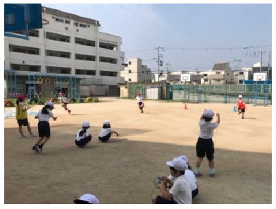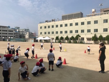 1時間目の2年生の体育。校舎の影をうまく使いながら、いろんな運動をしました。