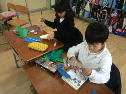 図工の時間、ミニクリスマスツリーを作りました。友達のグッドアイディアを聞きに言ったり、紙を分け合ったりしながらステキな飾りを作っています。