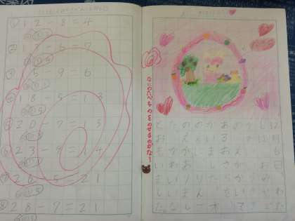 自主学習用に全校児童に配布したノートをみんなが工夫して使っています。1年生は、宿題(15分程度)の他に、漢字練習や計算、絵日記の他にも、算数の問題作りや動物や植物について調べたこと、国語の教科書の視写(写すこと)などバラエティーに富んだ自主学習を着々と進めています。お家の方もずいぶん協力してくださり、うれしく思います。ありがとうございます。