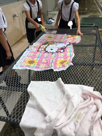 他(ほか)にも、チョコラのタオルをお洗濯(せんたく)してくれたんだよ。お日様(ひさま)と石鹸(せっけん)の匂(にお)いで、ぐっすり眠(ねむ)れそう!!
