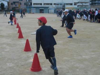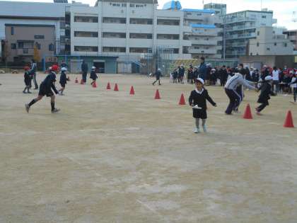 今日の集会は、バドミントンのラケットでシャトルを運ぶ遊びをしました。シャトルを落とさずに運ぶのは思った以上に難しく、苦労しながら運んでいました。しかし、中には器用に運ぶ子も。ゴールが近づくと、応援の声も次第に大きくなってきました。朝の寒さを吹き飛ばす子どもたちの歓声が運動場に響き渡っていました。
