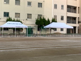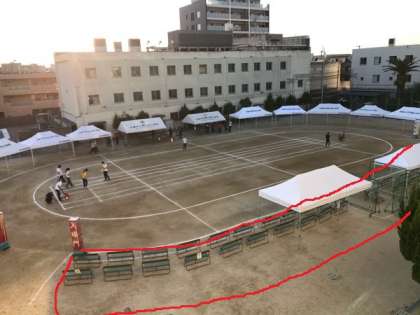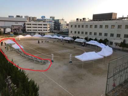 入場門から退場門までの、東校舎側一面を保護者席にしております。長椅子は40脚用意しております。ゆったり観ていただけるようにしました。