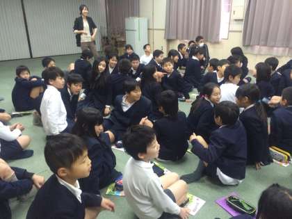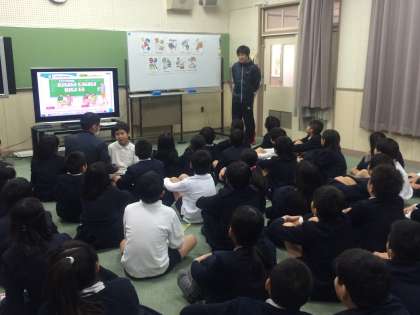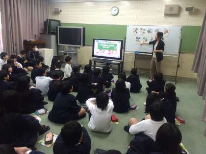 1組、2組合同で行いました。「夢の時間割をつくろう」ということで、教科の英語での呼び方を繰り返し練習したり、どの教科が好きか聞きあったりしました。