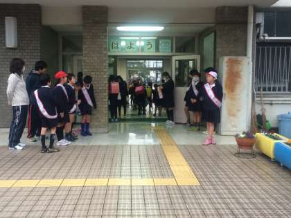 今朝は、雨が降っていたので、玄関内で児童会代表メンバーがあいつ運動をしました。雨を吹き飛ばすくらいの元気な声で、気持ちよく1日がスタートできます。