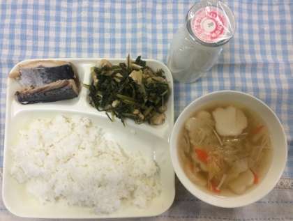 献立は、ごはん、さごしのしょうゆだれかけ、すまし汁、水菜の煮びたし、牛乳でした。
