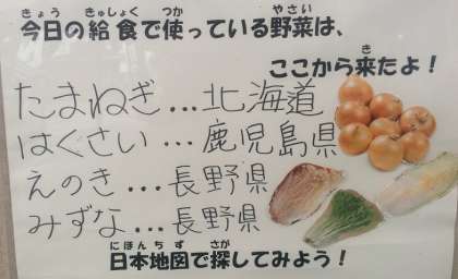 すまし汁に入っている玉ねぎ、はくさい、えのきや水菜の産地が給食室前の掲示板に張ってあります。毎日給食調理員さんが、張替えてくれています。