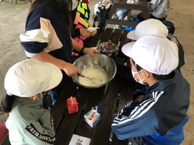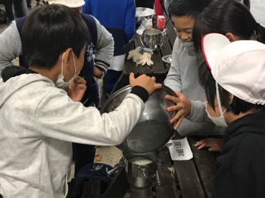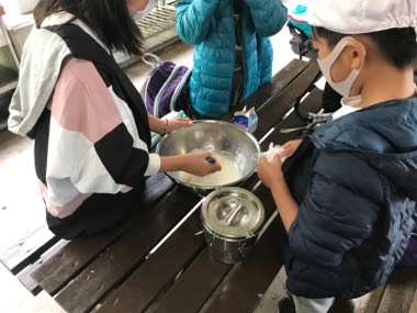 泡立てに時間がかかるので、班のメンバーが交代で泡立てます。
