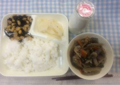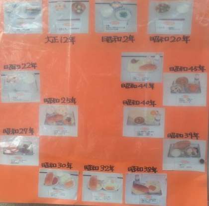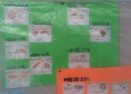 給食室前の掲示板に、給食の歴史をはっています。一番初めの給食は、明治22年山形県の小学校で始まりました。メニューは、おにぎり、焼き魚、つけものだったそうです。今の給食と比べてみてください。それぞれ、その時々の時代を反映していて興味深いメニューですね。