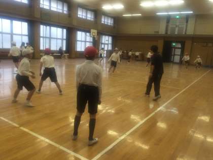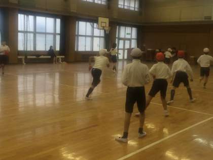 雨が降っていたので2クラス合同で体育館で行いました。最初は、「しっぽ取りゲーム」素早く逃げたり、しっぽをとったりと、思いっきり走り回りました。T先生の素早い動きに「ついていけない!!」「大人げない!」なんていう子も。いえいえ、先生も真剣勝負ですよ!
