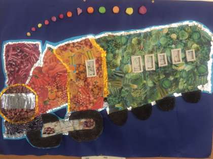 なかよし学級のみんなで作って出品しているのは、「なかよしカラフル号」。スポンジペーパーに色水をつけていろんなかたちをつくり、汽車に仕上げました。いろんな野菜や果物であふれている素敵な作品です。
