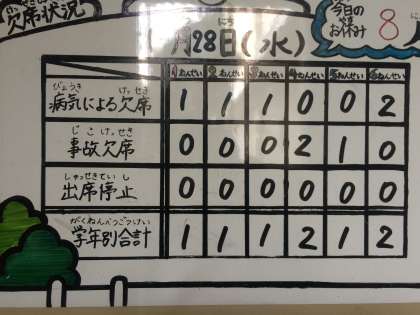 28日の欠席状況です。毎日保健室前にM先生が掲示してくれています。
