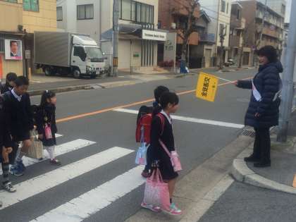 厚生女性会の方とPTAの方が、登校時の子どもたちの様子を見てくださっています。学校前の横断歩道は、赤信号でも自転車がとばしていくので、危険な時もあります。