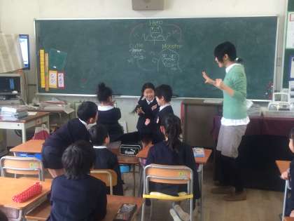 その後カナダのじゃんけん「Hero、Monster、Cutie」をしました。ちょうど国語科で自分が考えたじゃんけんを説明するという学習をしていたので、よその国のじゃんけんを知ることができて、ぴったりの活動でした。