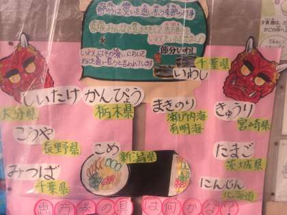 給食室前に節分に関する掲示をしました。食べ物を通して季節や、伝統文化を感じ取ってほいいです。