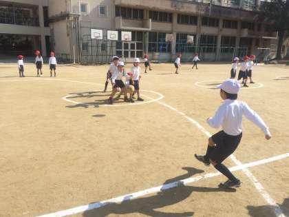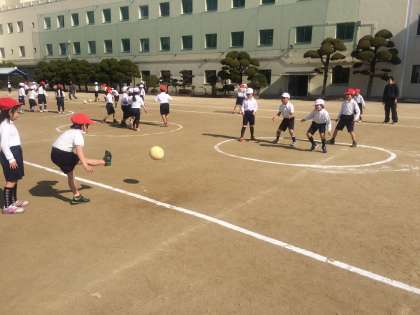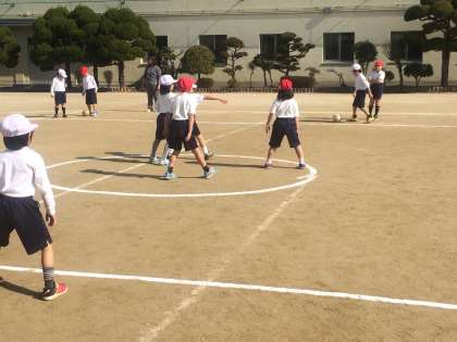 体育の学習です。体操、かけ足の後、ボールけりゲームをしました。