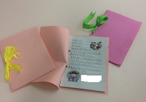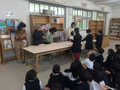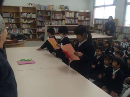 1年間、朝や昼のお話会でたくさんの本を読んでくださった図書ボランティア「ほうせんか」のみなさん。感謝の気持ちを手紙に書き、代表が読んで渡しました。