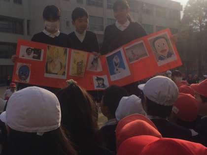 今朝の児童集会は、キャラクターを低・中・高学年ごとに覚えて班に持ち帰り、たくさん覚えることができたチームが勝ちというゲームをしました。