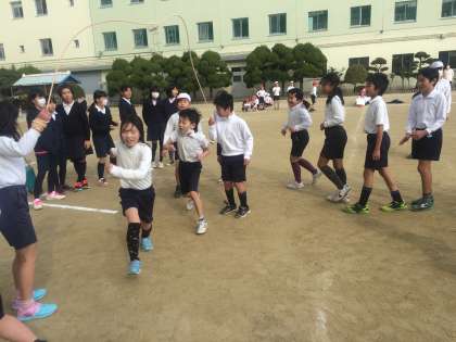 高学年は、8の字跳びで何回連続して跳ぶことができたかを競います。「ドンマイ!」の声が響いています。