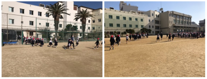 「押さない、走らない、しゃべらない、もどらない」をきちんと守り校舎内では歩いて移動。広い運動場では走って移動し列を作りました。