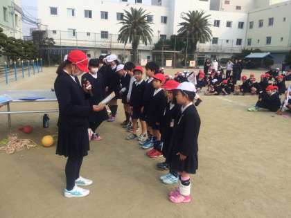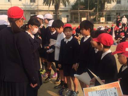 ステレオゲームの後、先週行ったなわとび大会の表彰式を行いました。学年ごとに優勝チームなどに表彰状が渡されました。運動委員会の児童の手作りです。