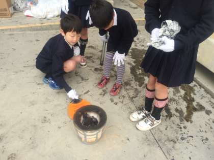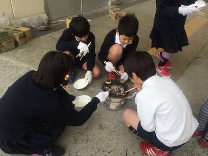 社会科「昔のくらし」の学習で、七輪で火をおこし、餅を焼いて食べました。初めはなかなか炭に火がつかず、何度も新聞紙や割り箸を入れたり、みんなで交代してうちわで風を送ったり、とても苦労しました。