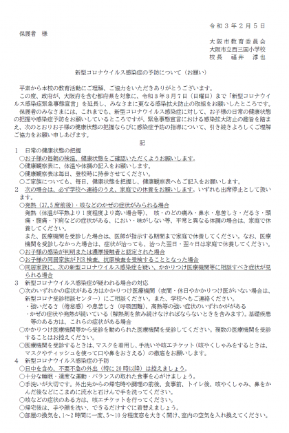 本日2月5日(金曜日)付で『新型コロナウイルス感染症の予防について(お願い)』を配付しておりますのでご覧ください。