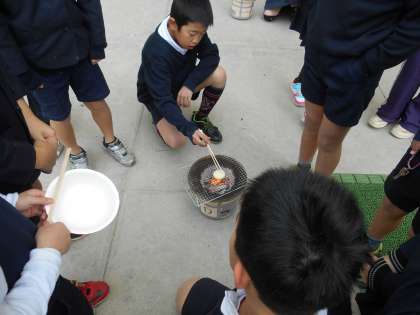 悪戦苦闘しながらも、笑顔でおもちを焼いて食べていました。