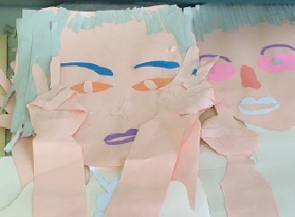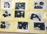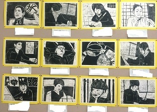 版画の作品をどの学級にも掲示しています。1年生は、刷り上がる前の型を展示しています。
